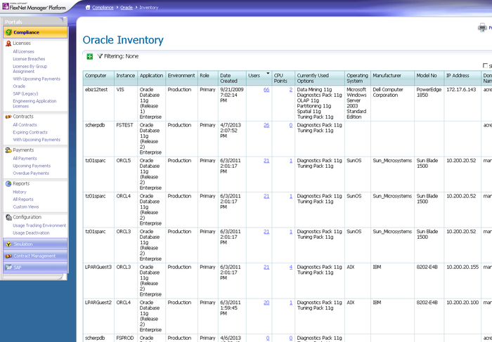 FlexNet Manager for Oracle supports numerous Oracle license models including Processor, Named User Plus (NUP) and Application User. Its Product Use Rights Library contains the Oracle core factor table and the NUP user minimums per processor to enable it to calculate an accurate license position. It also understands and applies Oracle’s virtual environment licensing rules for both hard (LPAR, vPar, Solaris Zones, etc.) and soft (VMware ESX/vSphere, Microsoft Hyper-V) partitioning technologies. As a result, FlexNet Manager for Oracle is able to report license compliance and over licensed situations for Oracle software running in today’s dynamic IT environments.