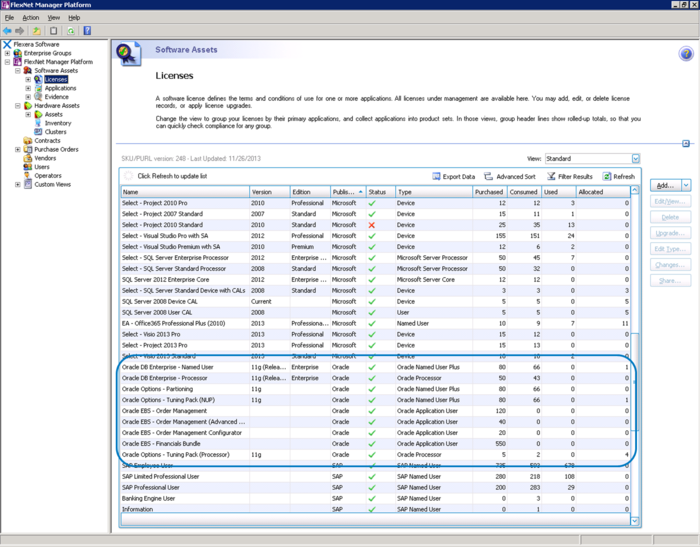 “FlexNet Manager for Oracle is an enterprise scale Software License Optimization solution that is built on FlexNet Manager Platform. It automates and optimizes license management to enable the reduction of license, maintenance and audit costs for Oracle software, while maintaining software license compliance.