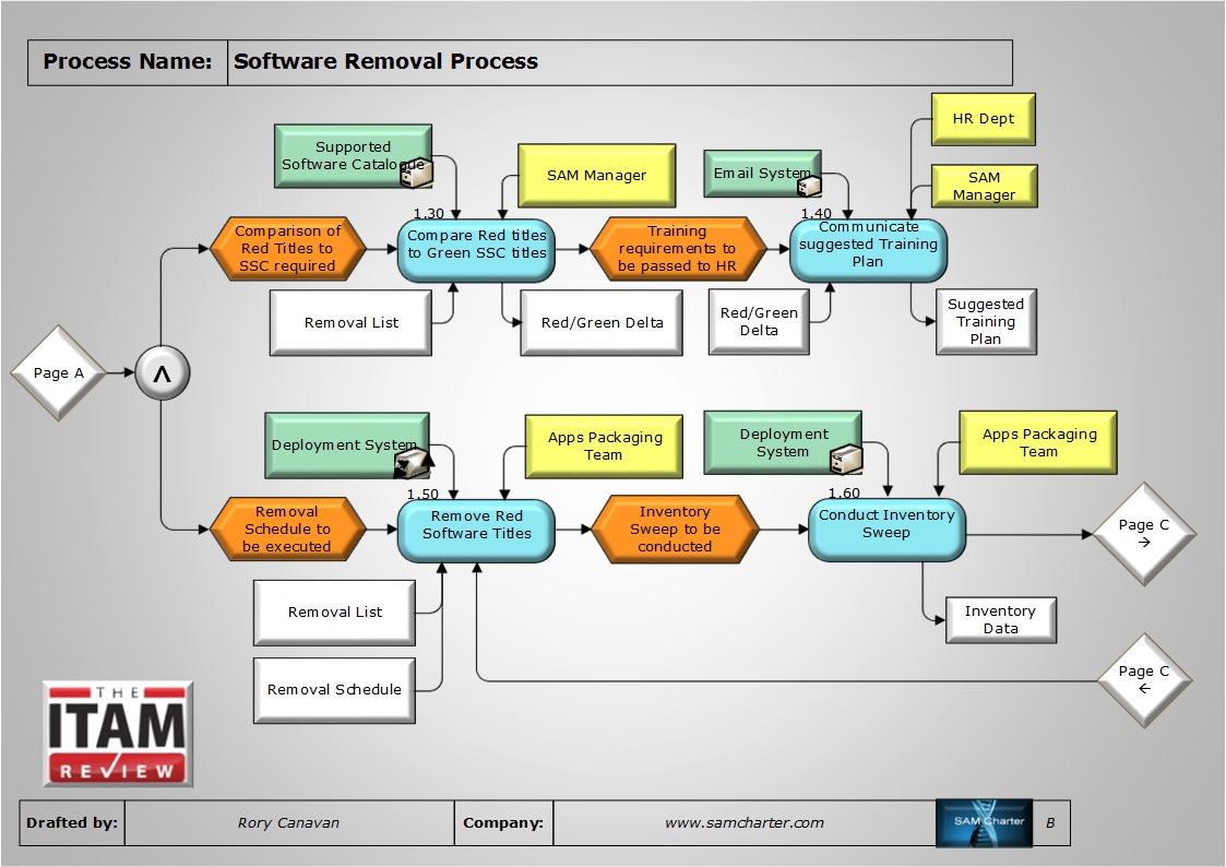| 1.20 | At 1.20, the SAM Manager is required to inform stakeholders (including end users) of the impending removal of any red titles. The product champions and service owners should already know, in that they were involved in the decision making processes prior to this function step, but it bodes well to keep them in the loop as most likely end users could see them as a first port of call for information on how the removal might affect them. |